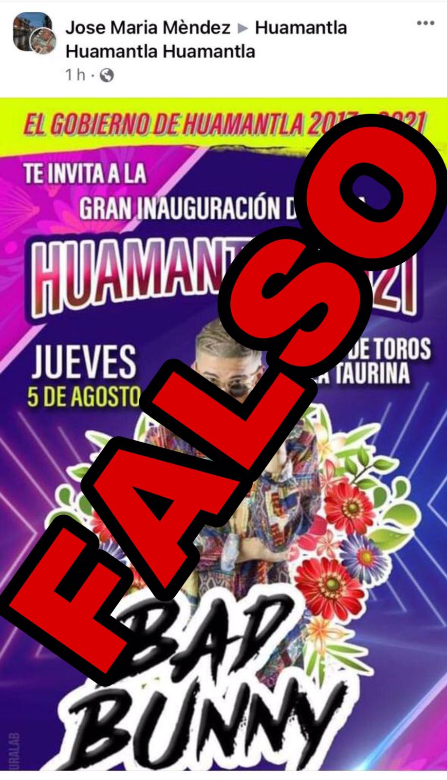 El Presidente Municipal de Huamantla, Jorge Sánchez Jasso, desmiente la publicación del cartel que circula en redes sociales a través de la página de Facebook Huamantla, Huamantla, Huamantla, con el nombre de "José María Méndez", en donde dan a conocer la supuesta inauguración de la Feria Nacional de Huamantla 2021 con la presentación artística de Bad Bunny el próximo 5 de agosto.