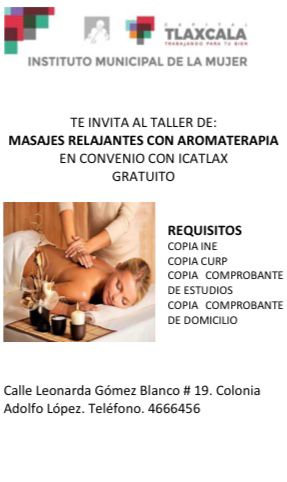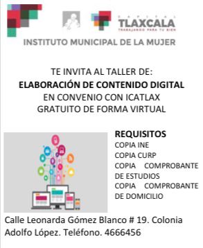 El ayuntamiento de Tlaxcala a través del Instituto Municipal de la Mujer (IMM) en coordinación con el Instituto de Capacitación para el Trabajo del Estado de Tlaxcala (ICATLAX), invitan a la sociedad a inscribirse a los talleres gratuitos con cupo limitado, para sacar provecho de las actividades que se están realizando y puedan aprender de manera profesional los aspectos que implican los temas.