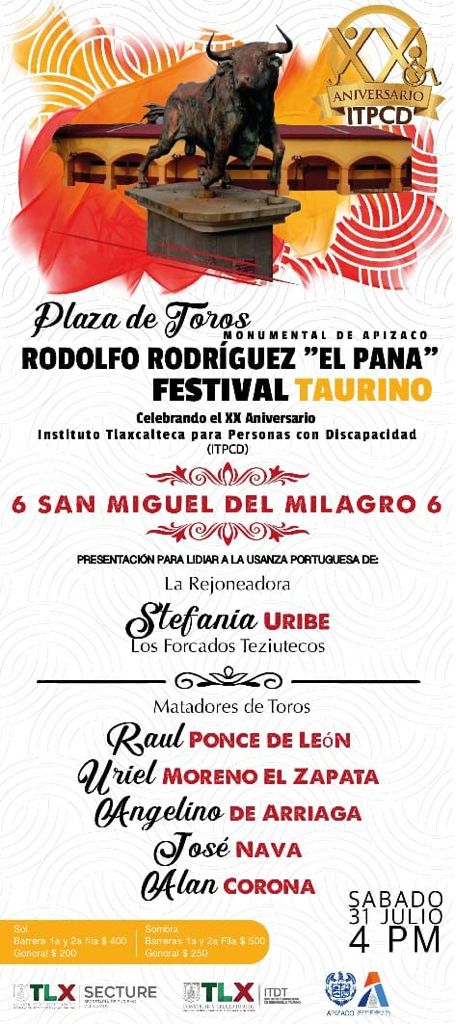 El segundo evento conmemorativo será un Festival Taurino, que se llevará a cabo el sábado 31 de julio, a las 16:00 horas, en la Plaza de Toros Rodolfo Rodríguez "El Pana" de Apizaco.