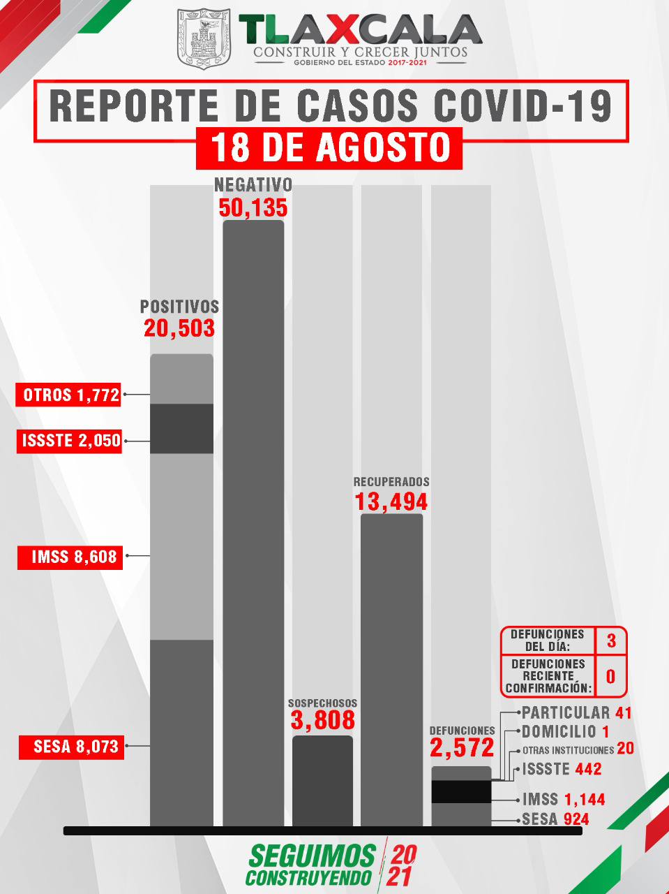 De acuerdo con el reporte del 18 de agosto, la Secretaría de Salud del Estado (SESA) confirmó 27 personas recuperadas, tres fallecimientos y 97 casos positivos de Covid-19 de tlaxcaltecas identificados en el estado y dos en otras entidades.