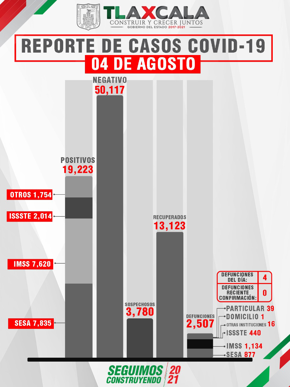 Hasta este momento, Tlaxcala registra tres mil 531 casos, Apizaco dos mil 294, Chiautempan mil 258, Huamantla 978, Zacatelco 895, Yauhquemehcan 625, San Pablo del Monte 562, Contla 536, Ixtacuixtla 482, Calpulalpan 468, Totolac 449, Tetla 438, Panotla 419, Papalotla 412, Tlaxco 403, Apetatitlán 350.