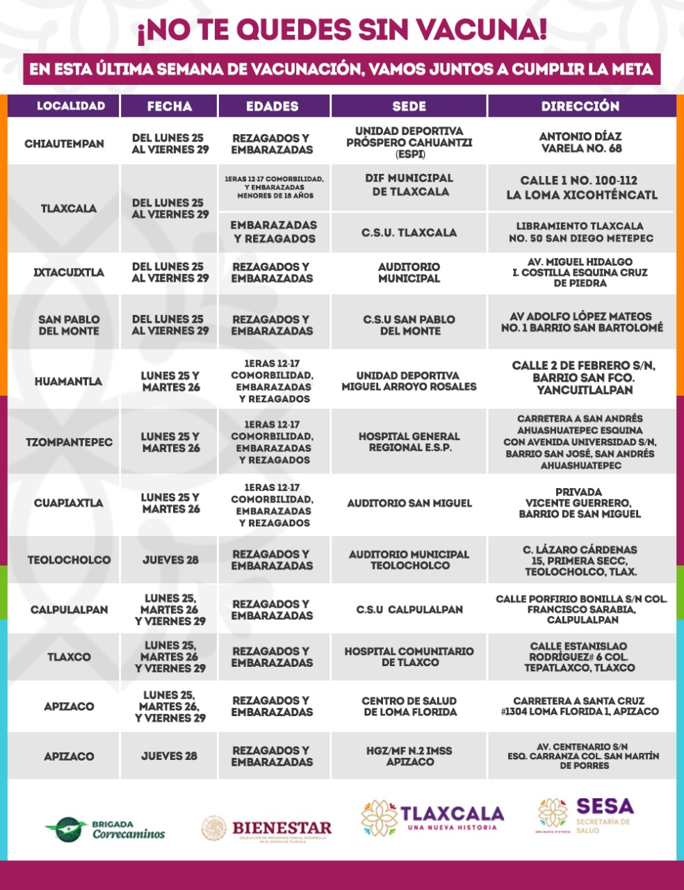 El 25 y 26 de octubre, la población rezagada mayor de 18 años, adolescentes de 12 a 17 años con comorbilidades y embarazadas, deberán presentarse a recibir su dosis en la unidad deportiva Miguel Arroyo Rosales de Huamantla, en el Hospital Regional de Tzompantepec y en el auditorio municipal de Cuapiaxtla.