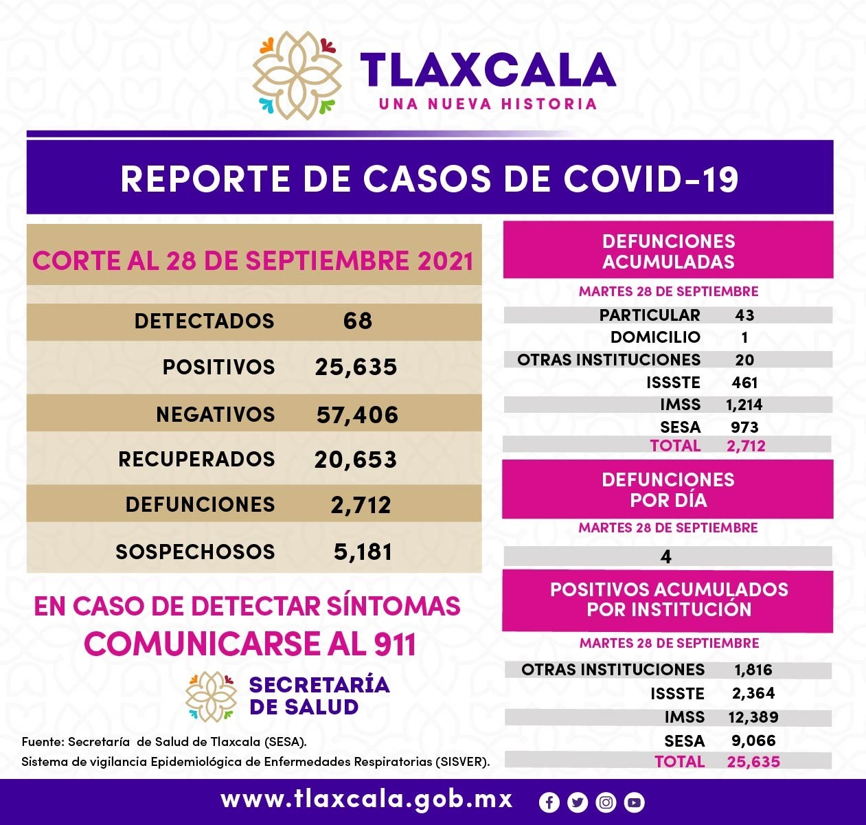 Los datos de la SESA registrados en la plataforma nacional del Sistema de Vigilancia Epidemiológica de Enfermedades Respiratorias (SISVER), confirmaron 68 casos positivos de Covid-19 y cuatro defunciones al martes 28 de septiembre de 2021.