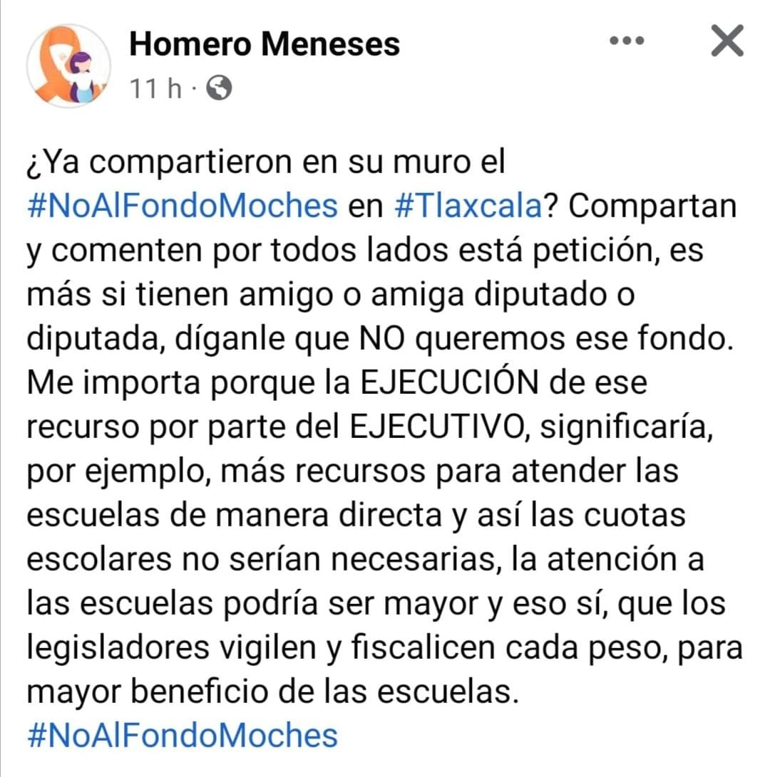 "¿Ya compartieron en su muro el #NoAlFondoMoches en #Tlaxcala? Compartan y comenten por todos lados está petición, es más si tienen amigo o amiga diputado o diputada, díganle que NO queremos ese fondo. Me importa porque la EJECUCIÓN de ese recurso por parte del EJECUTIVO, significaría, por ejemplo, más recursos para atender las escuelas de manera directa y así las cuotas escolares no serían necesarias, la atención a las escuelas podría ser mayor y eso sí, que los legisladores vigilen y fiscalicen cada peso, para mayor beneficio de las escuelas.