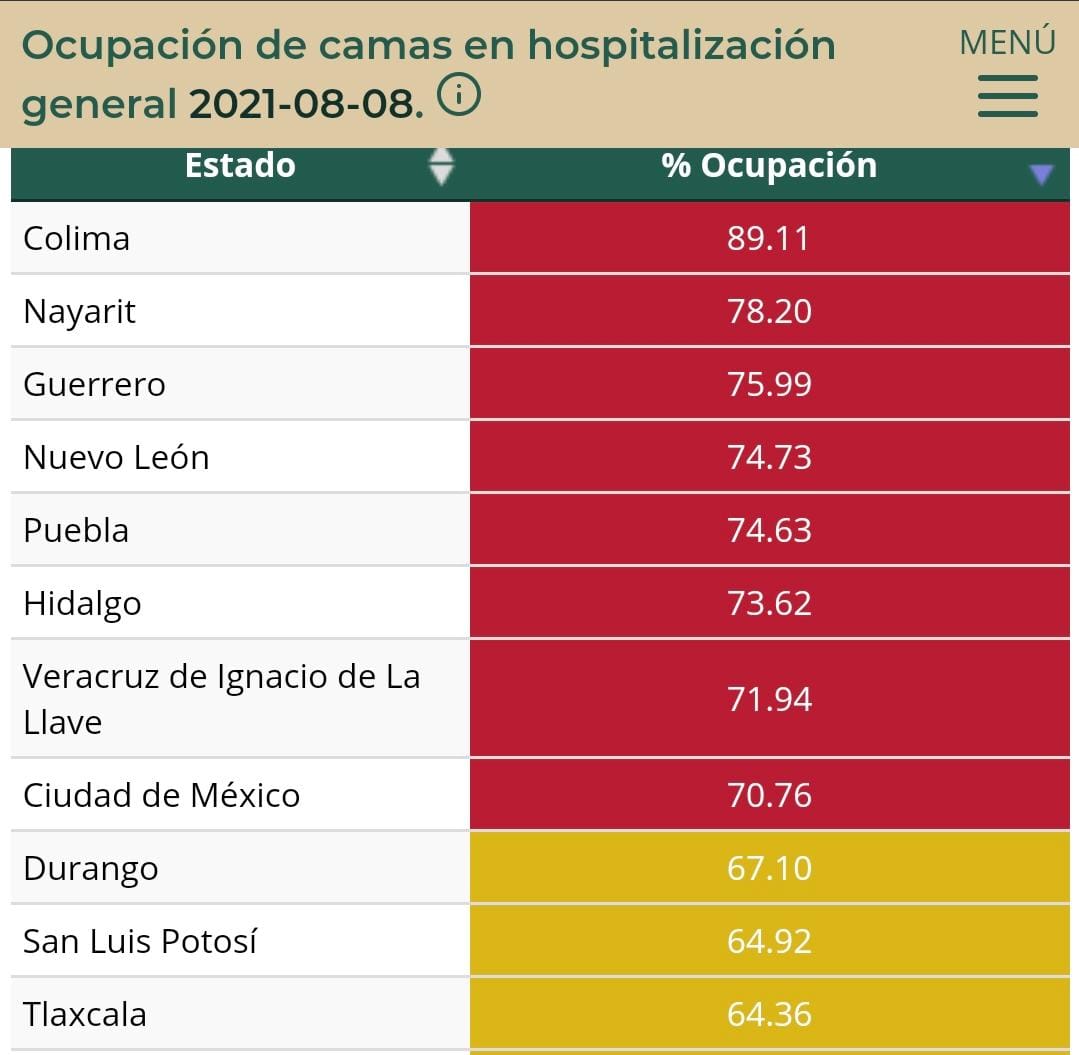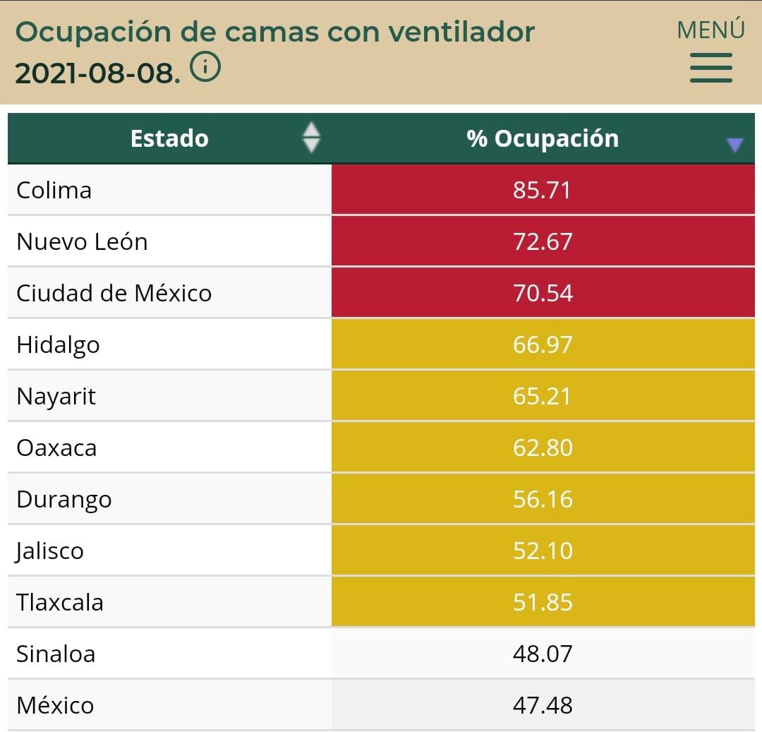 Incluso está situación coloca a Tlaxcala como la novena entidad con mayor ocupación en estos recursos y se coloca ya en color anaranjado tanto en la ocupación de camas generales como de ventiladores, lo que indica que se acerca a la saturación.