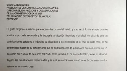 El Ayuntamiento de Xaloztoc, se encuentra en una situación financiera crítica, ya que no cuenta con los recursos necesarios para pagar los salarios
