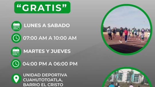 La Dirección de Deportes municipal imparte entrenamiento sin costo en la Unidad Deportiva Cuahutotoatla, con horarios matutinos y vespertinos
