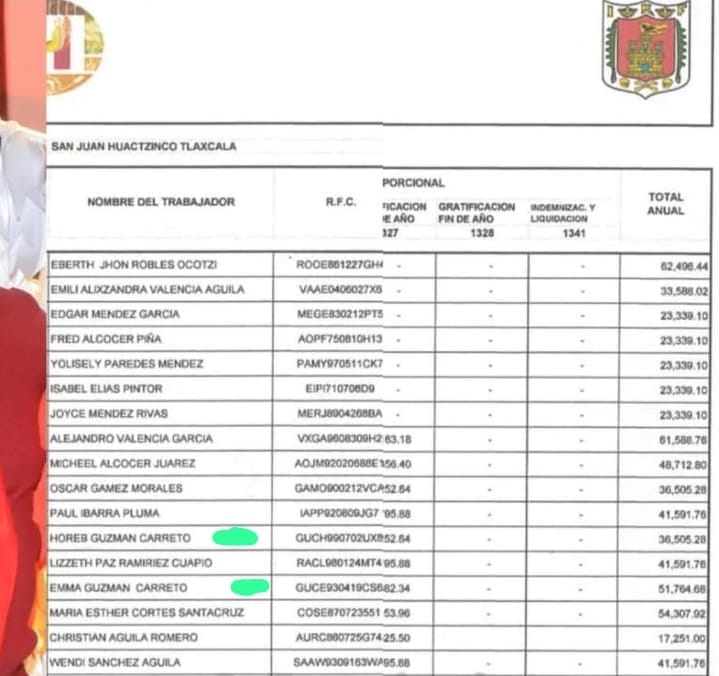 Trabajadores de la presidencia municipal de San Juan Huactzinco denunciaron que el alcalde, Eberth Robles Ocotzi, mantiene en la nómina a la esposa de su hermano, Ema "N", y a la hermana de esta, Hores "N", quienes presuntamente perciben sueldos excesivos sin presentarse a laborar.