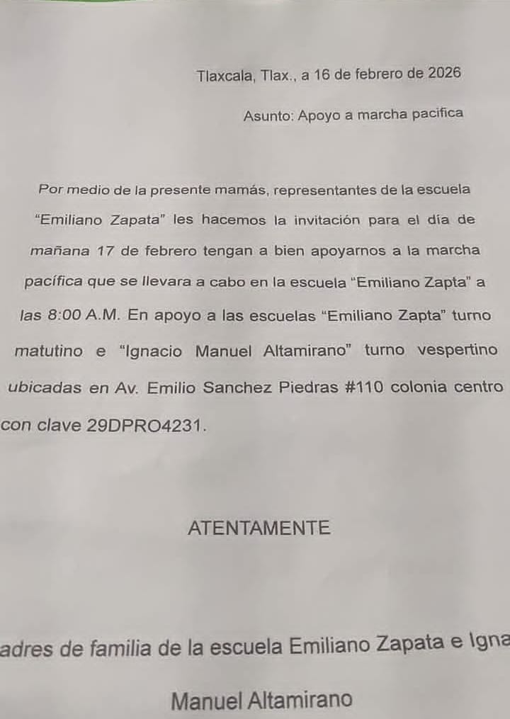 Padres de familia de familia de la escuela primaria de doble turno "Emiliano Zapata" e "Ignacio Manuel Altamirano", ubicada en la Avenida Emilio Sánchez Piedra en la colonia Centro, en Tlaxcala, han manifestado un rechazo contundente ante la determinación del Gobierno del Estado de Tlaxcala de reubicarla. La medida, que afecta a los turnos matutino y vespertino que comparten el inmueble, por los que los tutores mantienen su postura de no reubicación y convocan a una movilización.