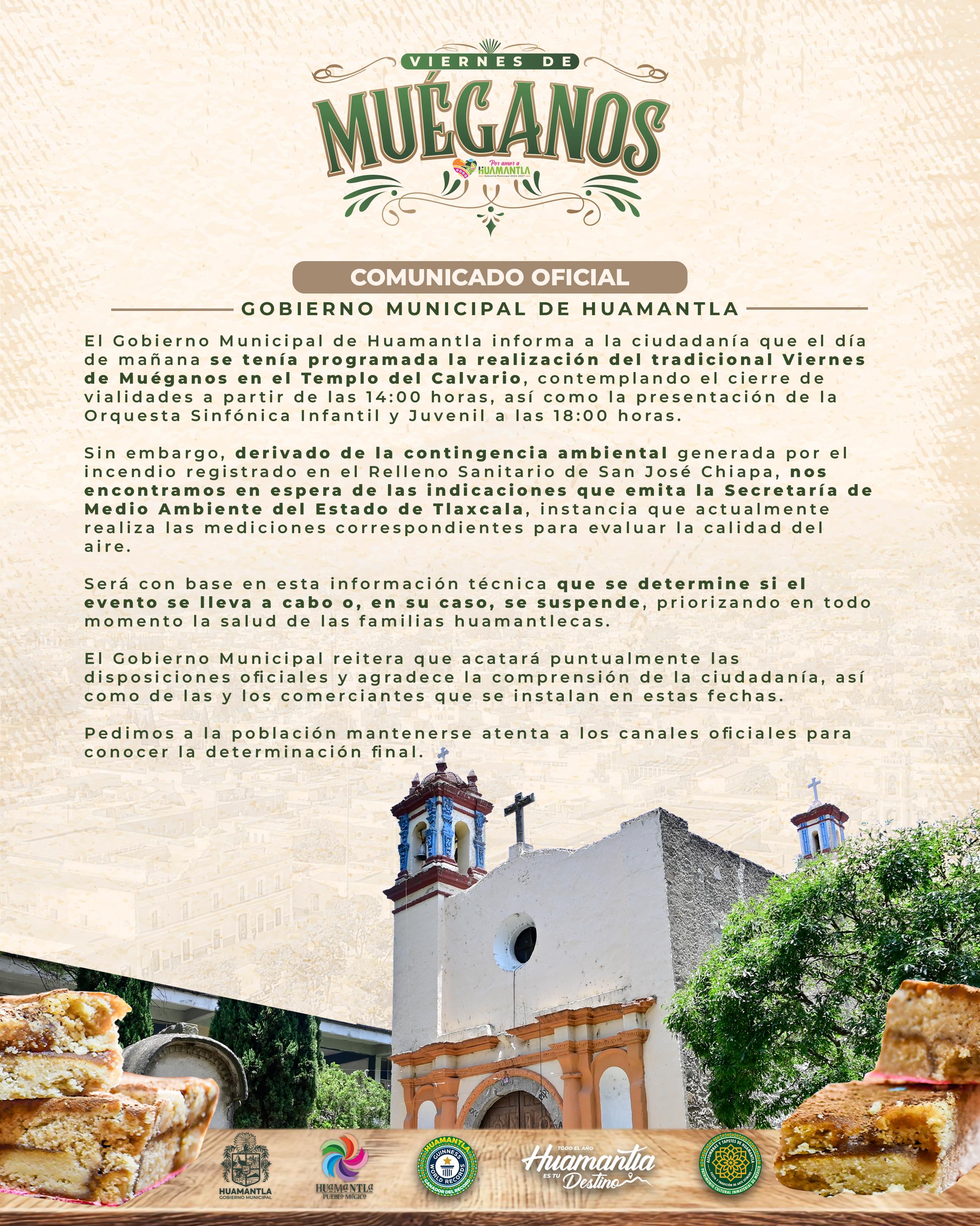El Gobierno Municipal de Huamantla informa a la ciudadanía que el día de mañana se tenía programada la realización del tradicional Viernes de Muéganos en el Templo del Calvario, contemplando el cierre de vialidades a partir de las 14:00 horas, así como la presentación de la Orquesta Sinfónica Infantil y Juvenil a las 18:00 horas.