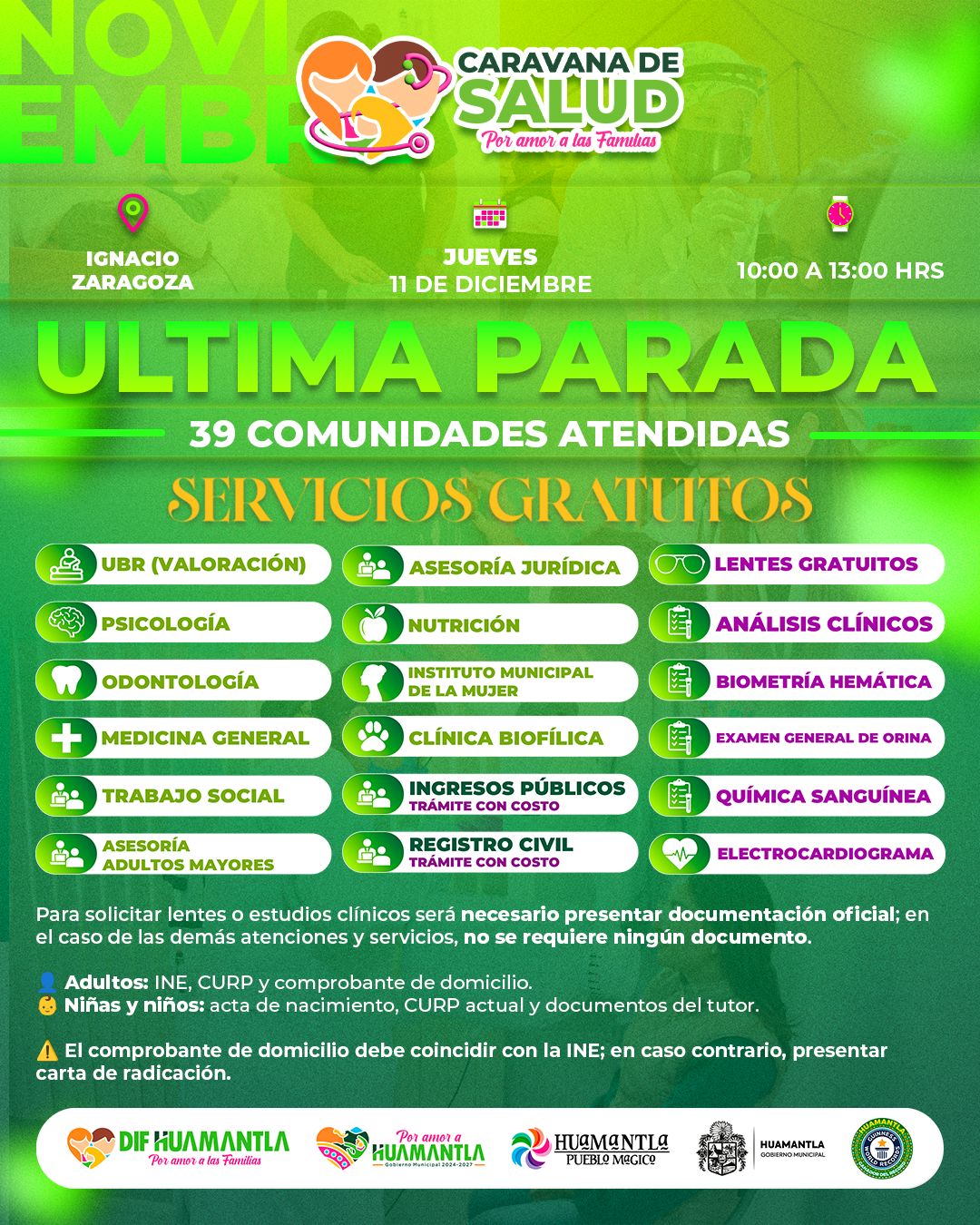 Con la Caravana de la Salud y Servicios “Por Amor a las Familias”, el Gobierno Municipal de Huamantla concluirá este 11 de diciembre en el pueblo de Ignacio Zaragoza un año de intenso trabajo que permitió acercar atención médica, servicios sociales y apoyos gratuitos a las 39 comunidades del municipio.