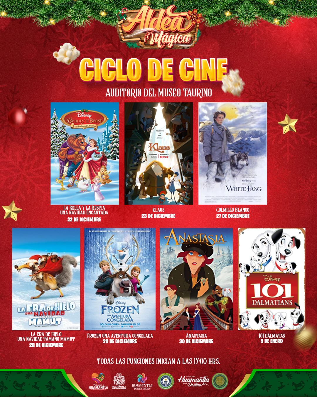 Las funciones iniciarán a las 17:00 horas, con una cartelera pensada para ofrecer historias llenas de emoción, aventura y espíritu navideño. La programación será la siguiente: