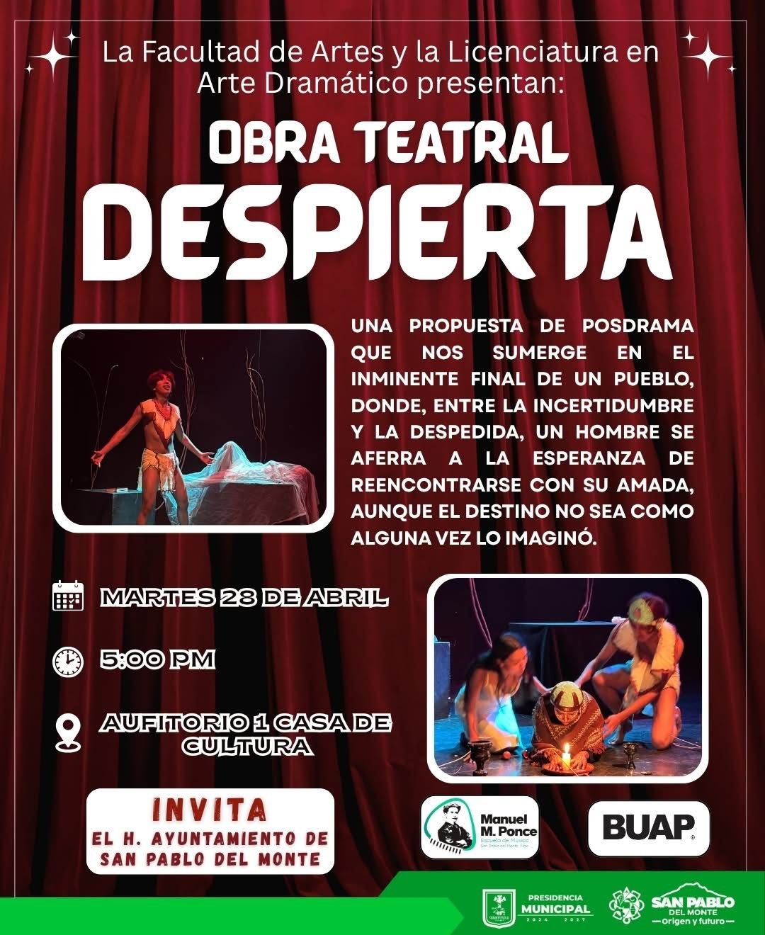 El Ayuntamiento de San Pablo del Monte, a través de la Escuela de Música Manuel M. Ponce, en coordinación con la Facultad de Artes y la licenciatura en Arte Dramático de la BUAP, invita al público en general a presenciar la obra teatral “Despierta”, que se llevará a cabo la tarde del 28 de abril en Casa de Cultura.