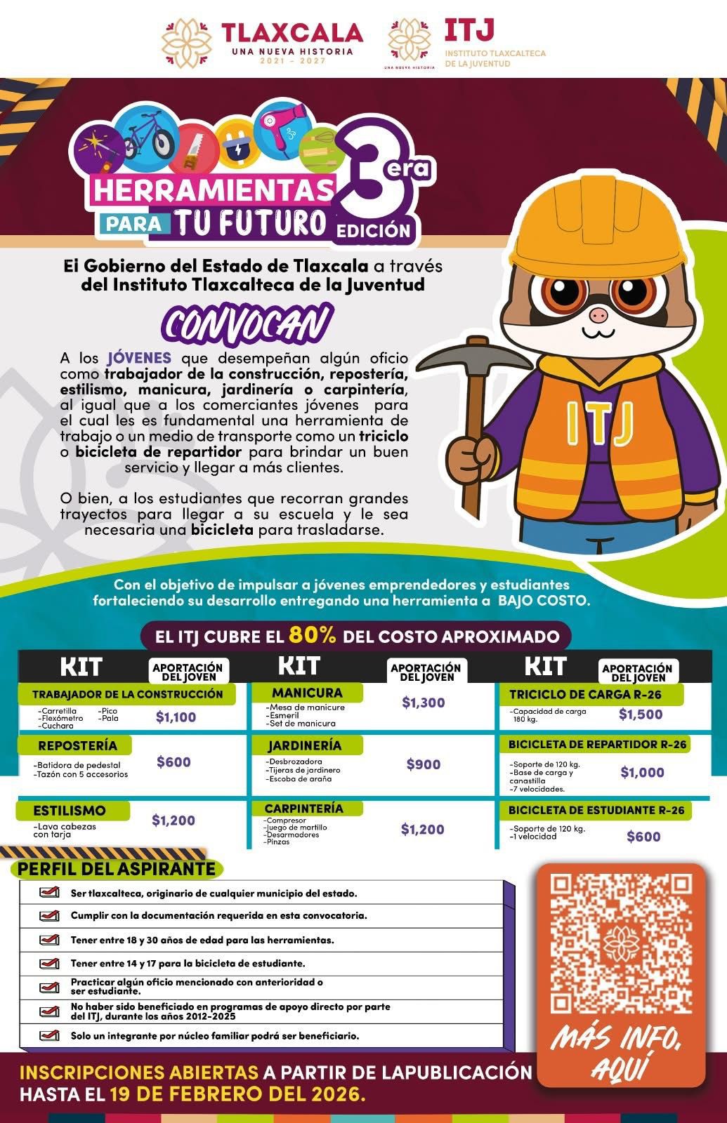 Con el objetivo de impulsar el talento, el desarrollo productivo y la movilidad de las juventudes, el Instituto Tlaxcalteca de la Juventud (ITJ) lanzó la convocatoria “Herramientas para tu Futuro”, dirigida a jóvenes de Huamantla que se desempeñan en algún oficio o que actualmente son estudiantes.