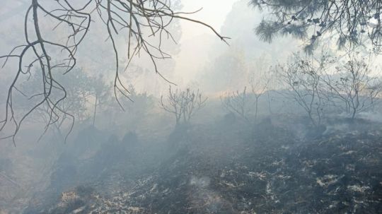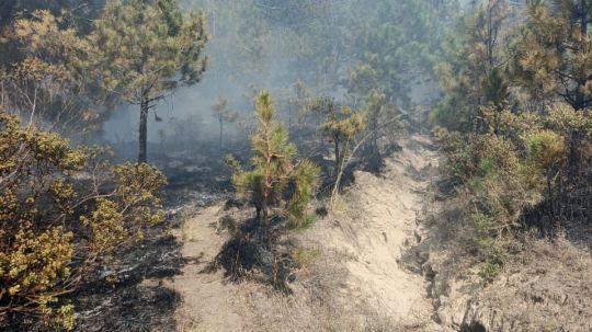 Al arribar al lugar, el personal constató la presencia de fuego que afectaba pastizal, arbustos y residuos de pino, por lo que se iniciaron de inmediato las labores para sofocar el incendio y evitar su propagación a zonas aledañas.