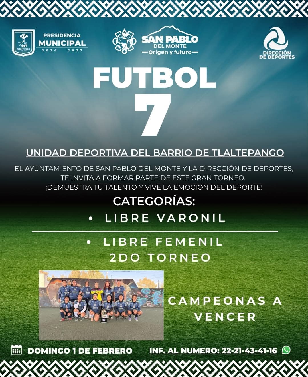 El Ayuntamiento de San Pablo del Monte, a través de la Dirección de Deportes, lanzó la convocatoria para el Torneo de Futbol 7 que se realizará en la Unidad Deportiva del Barrio de Tlaltepango, con el objetivo de impulsar la sana convivencia y el orgullo deportivo del municipio.