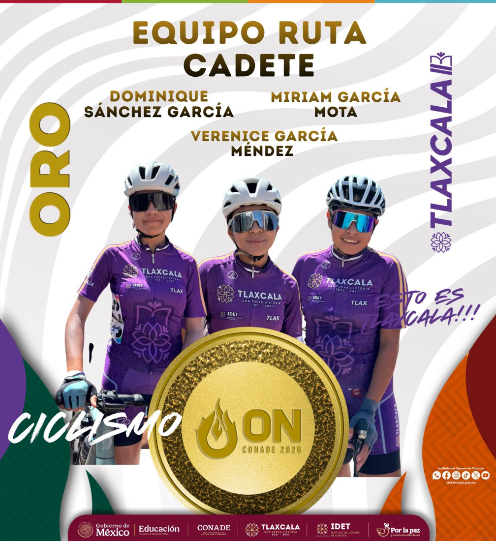 El primer oro llegó en la prueba por equipos, rama femenil, en la distancia de 60 kilómetros, donde el conjunto integrado por Dominique Sánchez García, Miriam Esmeralda García Mota y Verenice García Méndez demostró coordinación, resistencia y estrategia para imponerse ante sus rivales.