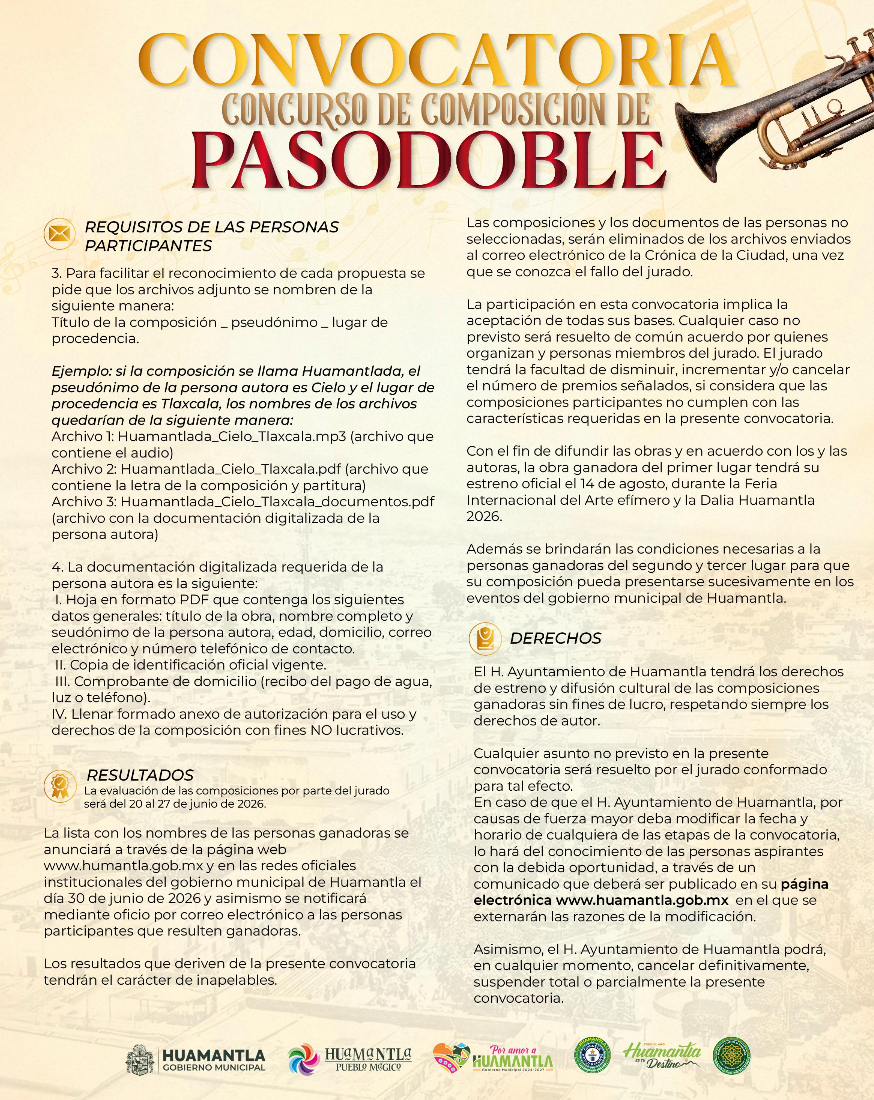 Con el objetivo de fortalecer y difundir una de las expresiones musicales más representativas de la tradición taurina, el Gobierno Municipal de Huamantla, en coordinación con el Instituto Tlaxcalteca de Desarrollo Taurino, la Crónica de la Ciudad y la Coordinación de Desarrollo Taurino, invita a la ciudadanía a participar en el Concurso de Composición de Pasodoble.