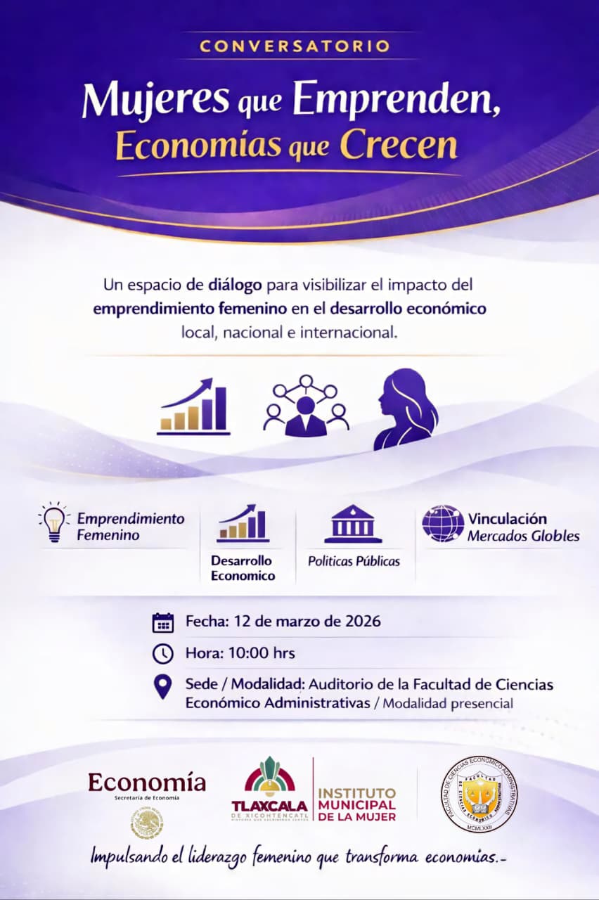 Con el objetivo de visibilizar el impacto del emprendimiento femenino en el desarrollo económico local, nacional e internacional, el Instituto Municipal de la Mujer (IMM), en colaboración con la Secretaría de Economía y la Facultad de Ciencias Económico Administrativas de la Universidad Autónoma de Tlaxcala (UATx), llevará a cabo el conversatorio "Mujeres que Emprenden, Economías que Crecen".
