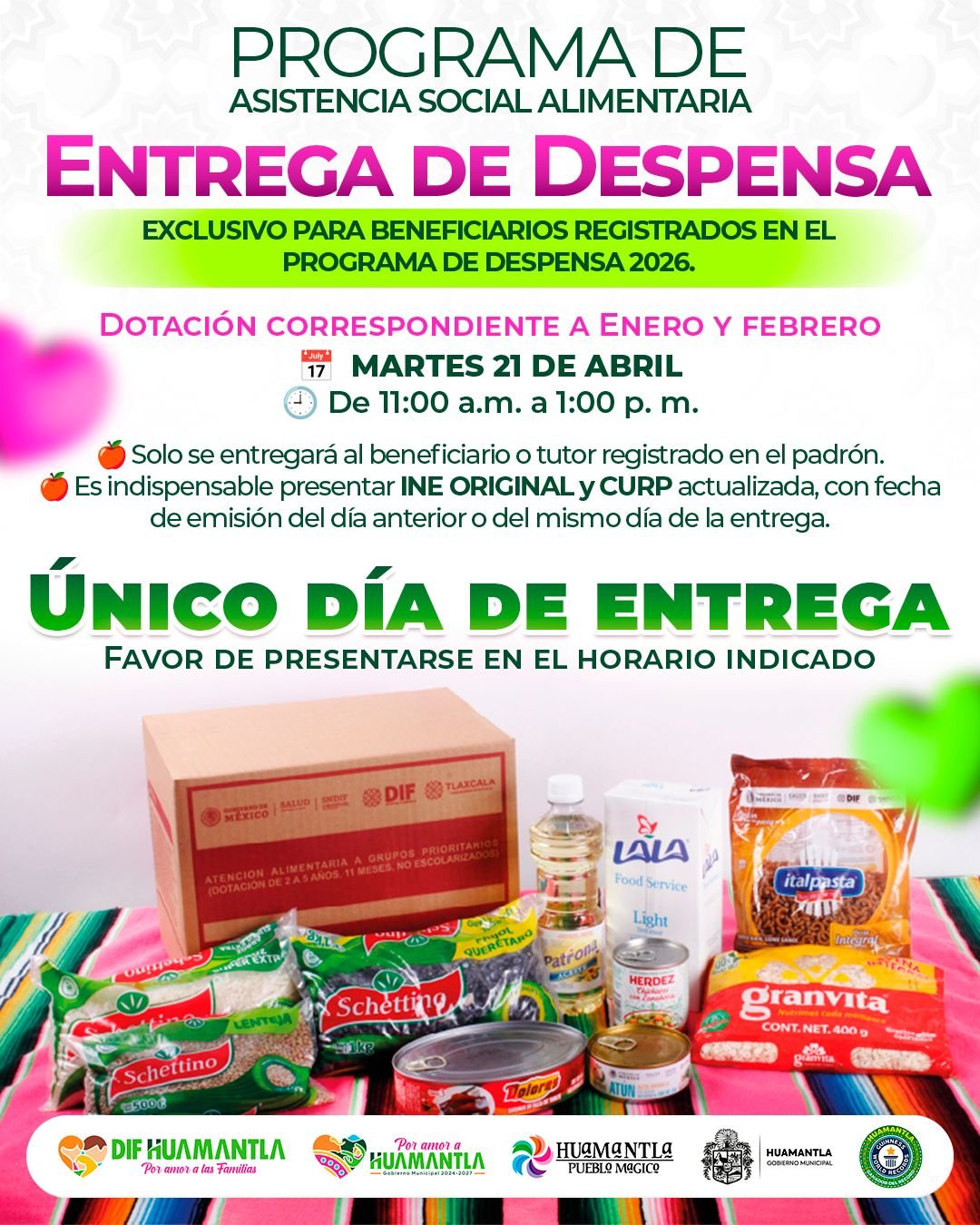 El SMDIF Huamantla hace un atento llamado a las y los beneficiarios para acudir en el horario establecido, ya que se trata de un único día de entrega, con el fin de garantizar un proceso ordenado y eficiente.
