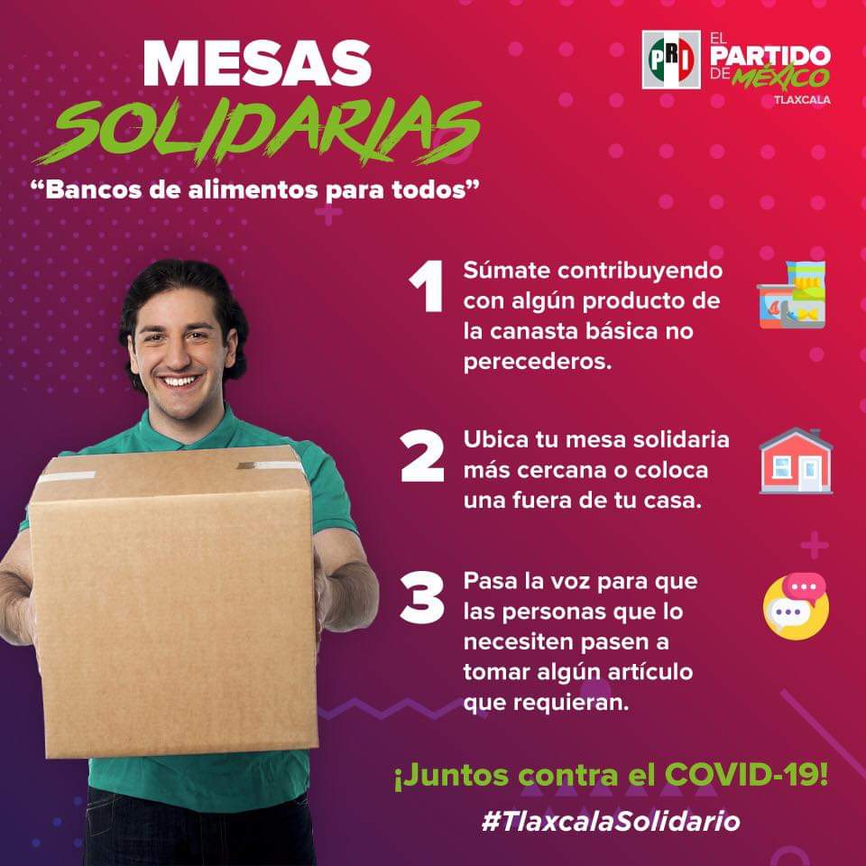 Con la invitación a donar de tener posibilidades o a acudir para recibir apoyo, en las instalaciones del PRI estatal se instaló un banco de alimentos al que denominaron "Mesas Solidarias".