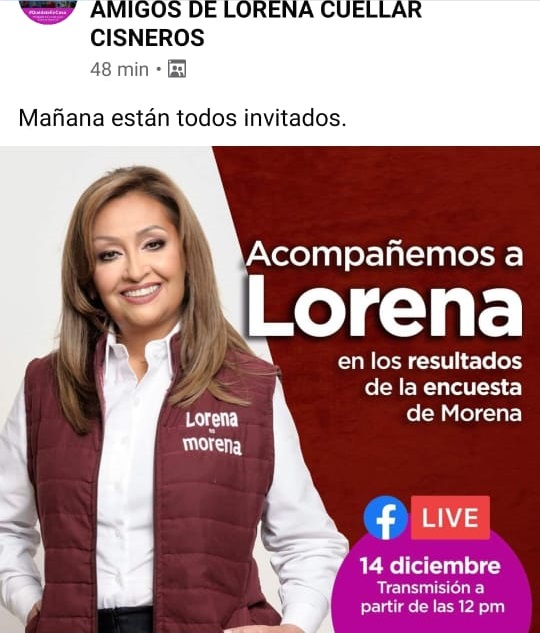Desde la tarde noche de este domingo, operadores políticos de Lorena Cuéllar Cisneros, se dieron a la tarea que circular en redes sociales, la invitación para que este lunes a las 12 horas, sean parte del evento en donde oficializarán a la exdelegada de bienestar como candidata de Morena a la gubernatura del estado.