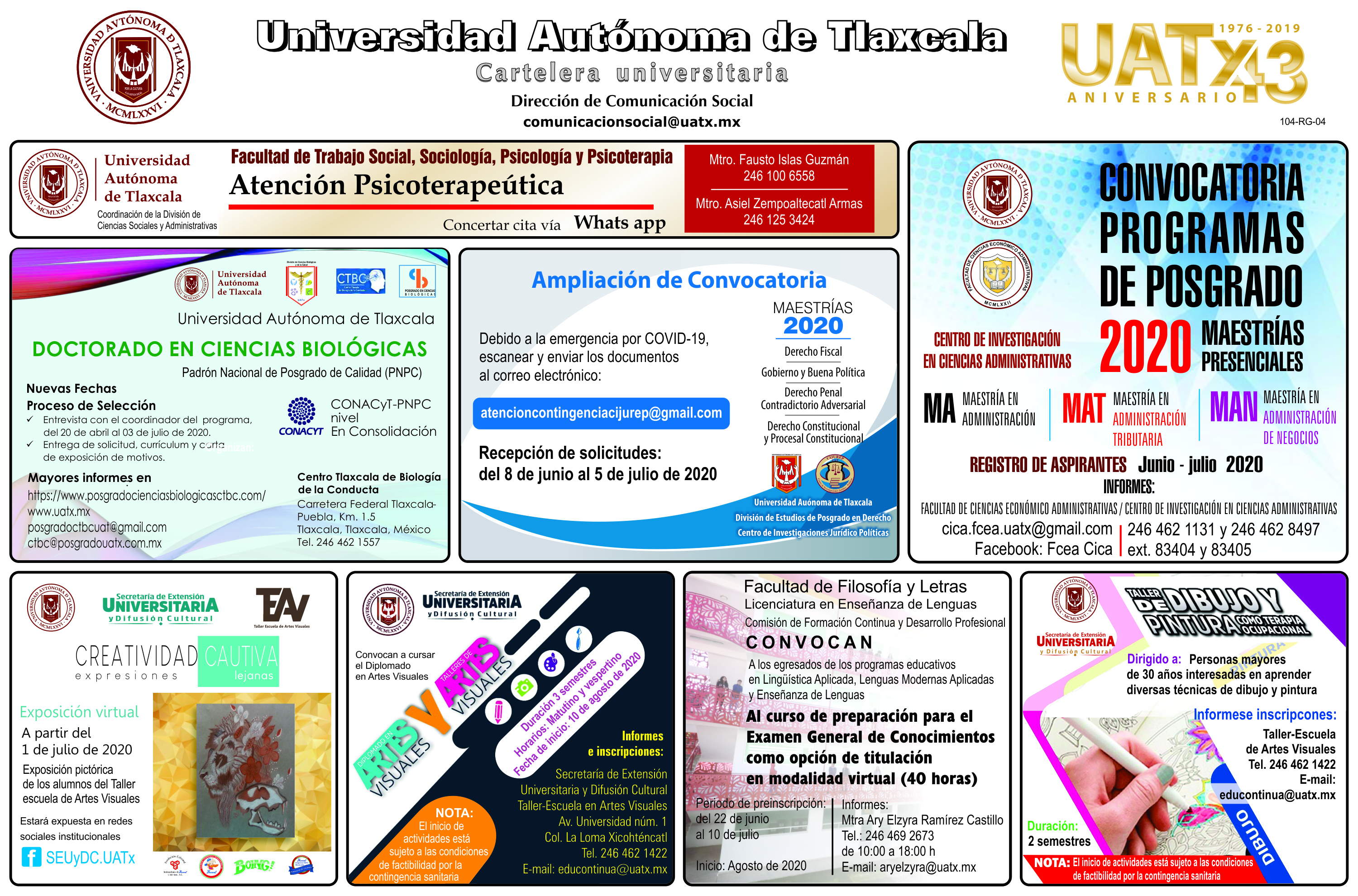 Conoce las actividades que desarrolla la UATx en distintos ámbitos con la Cartelera jueves 2 de julio de 2020