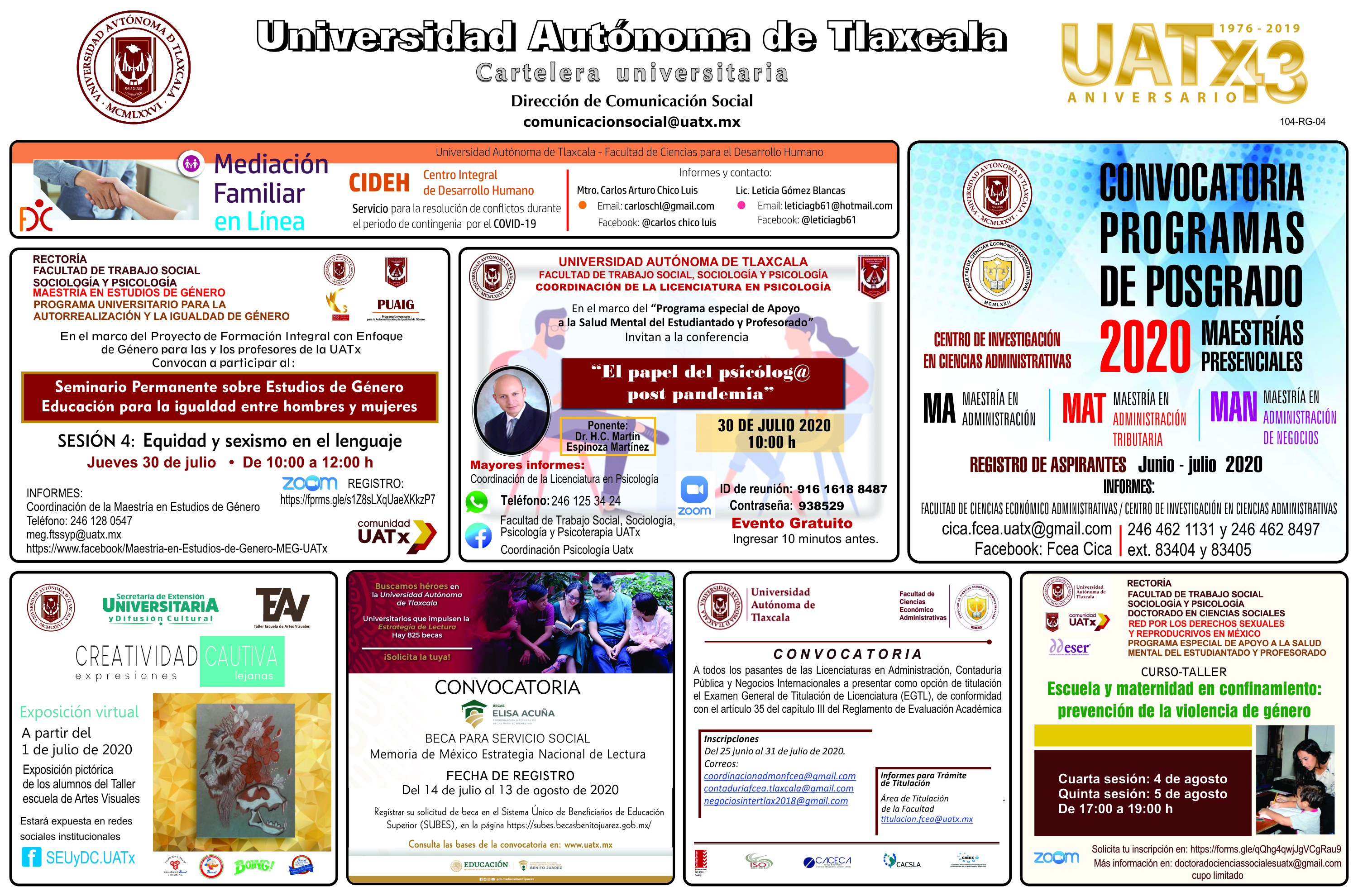 Conoce las actividades que desarrolla la UATx en distintos ámbitos con la Cartelera jueves 30 de julio de 2020