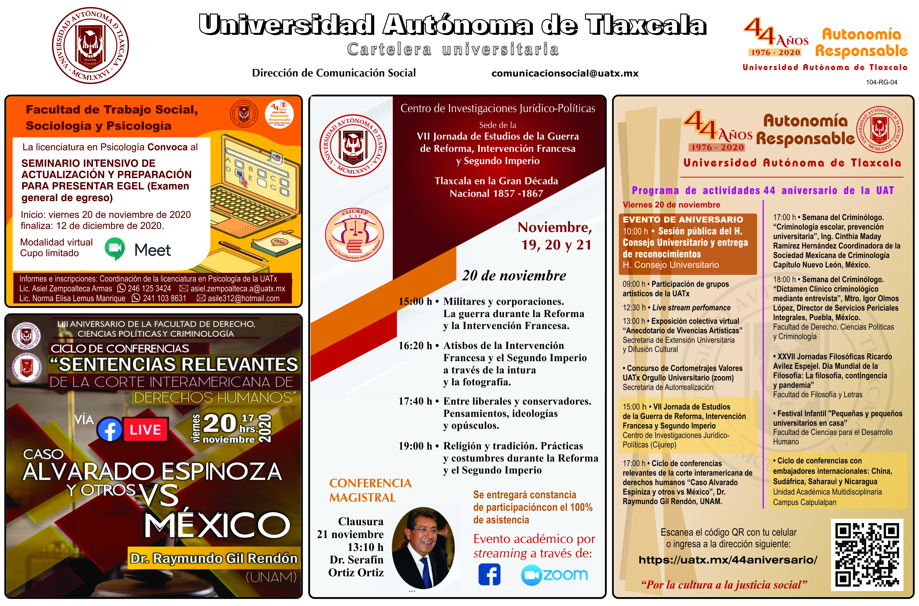 Conoce las actividades que desarrolla la UATx en distintos ámbitos con la Cartelera viernes 20 de marzo de 2020