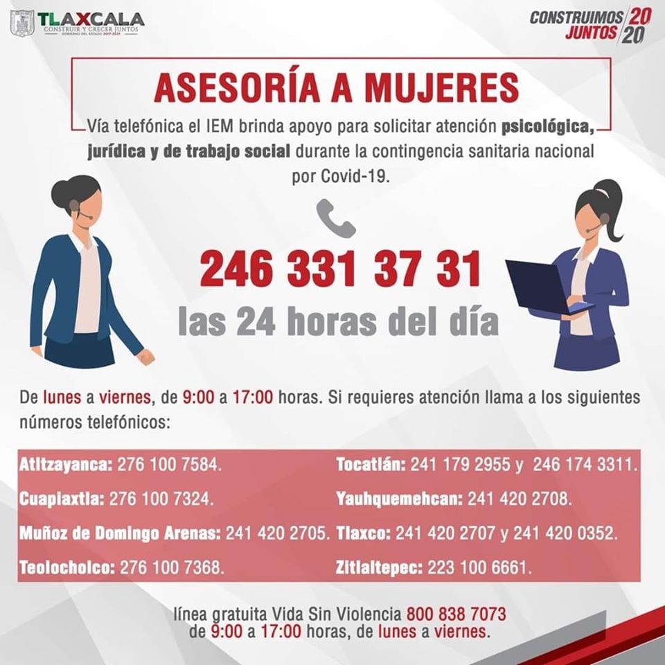El Instituto Estatal de la Mujer (IEM) informó que ha brindado 309 asesorías telefónicas a mujeres tlaxcaltecas, del 23 de marzo a la fecha, como parte del respaldo que ofrece la dependencia a este sector de la población durante la emergencia sanitaria nacional por Covid-19.