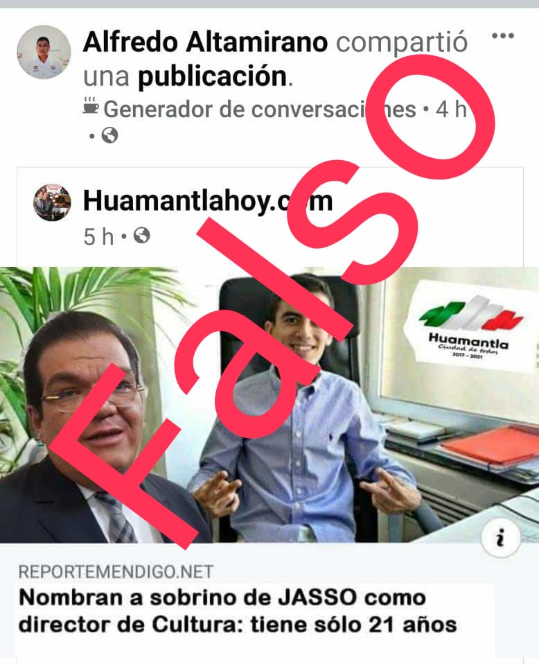 En redes sociales circula una noticia falsa sobre el supuesto nombramiento del sobrino del alcalde de Huamantla, Jorge Sánchez Jasso, como director de cultura de Huamantla, hecho que fue descartado completamente por la administración municipal.