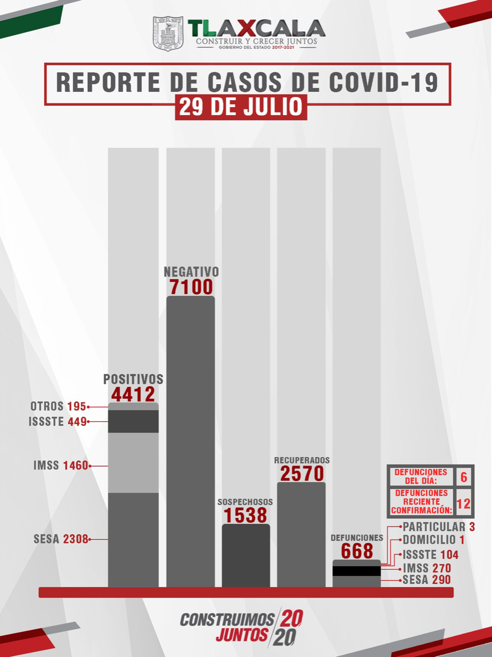 De esta manera, el estado registra dos mil 570 personas recuperadas, cuatro mil 412 casos positivos y 668 fallecimientos.