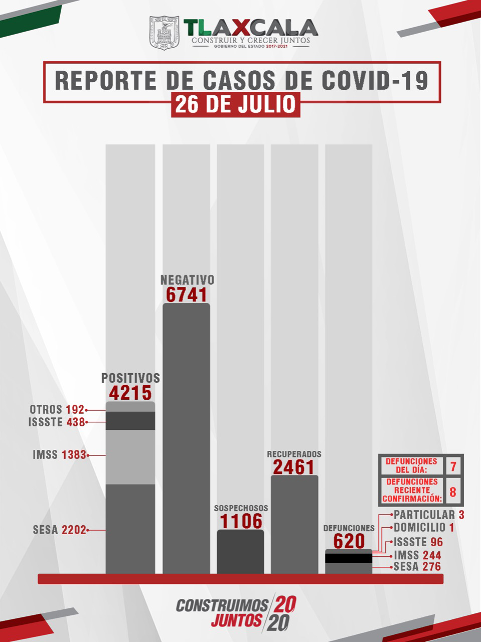De esta manera, el estado registra dos mil 461 personas recuperadas, cuatro mil 215 casos positivos y 620 fallecimientos.