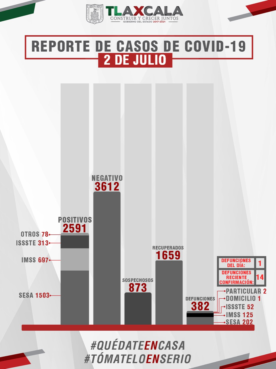 De esta manera, la entidad registra mil 659 personas recuperadas, dos mil 591 casos positivos y 382 fallecimientos.