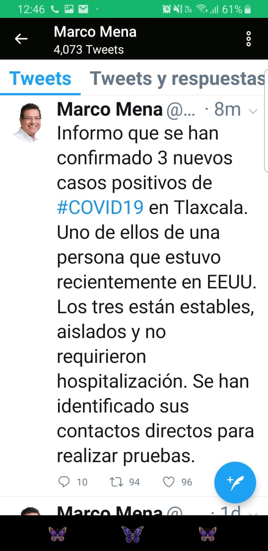 El gobernador del estado, Marco Antonio Mena Rodríguez, anunció en su cuenta de Twitter que ya son tres las personas contagiadas por Covid-19 en la entidad.