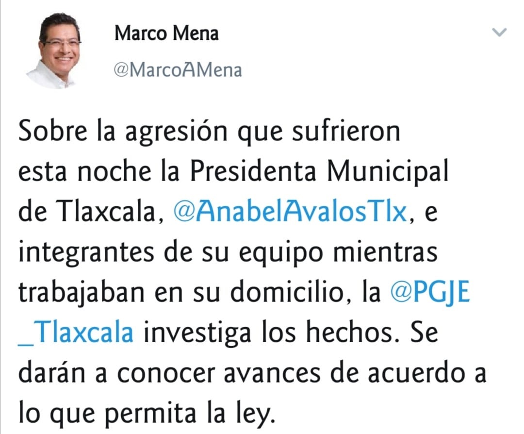 En sus cuentas de Twitter y Facebook, el Gobernador Marco Mena publicó: "Sobre la agresión que sufrieron esta noche la Presidenta Municipal de Tlaxcala, @AnabelAvalosTlx, e integrantes de su equipo mientras trabajaban en su domicilio, la @PGJE_Tlaxcala investiga los hechos. Se darán a conocer avances de acuerdo a lo que permita la ley".