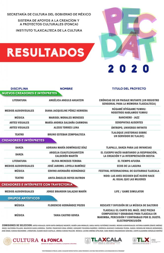 Para mayor información, los interesados podrán consultar los resultados y el dictamen del jurado calificador en las redes sociales del Instituto Tlaxcalteca de la Cultura, así como en las páginas oficiales: www.pecdaenlinea.cultura.gob.mx y www.culturatlaxcala.com.mx.