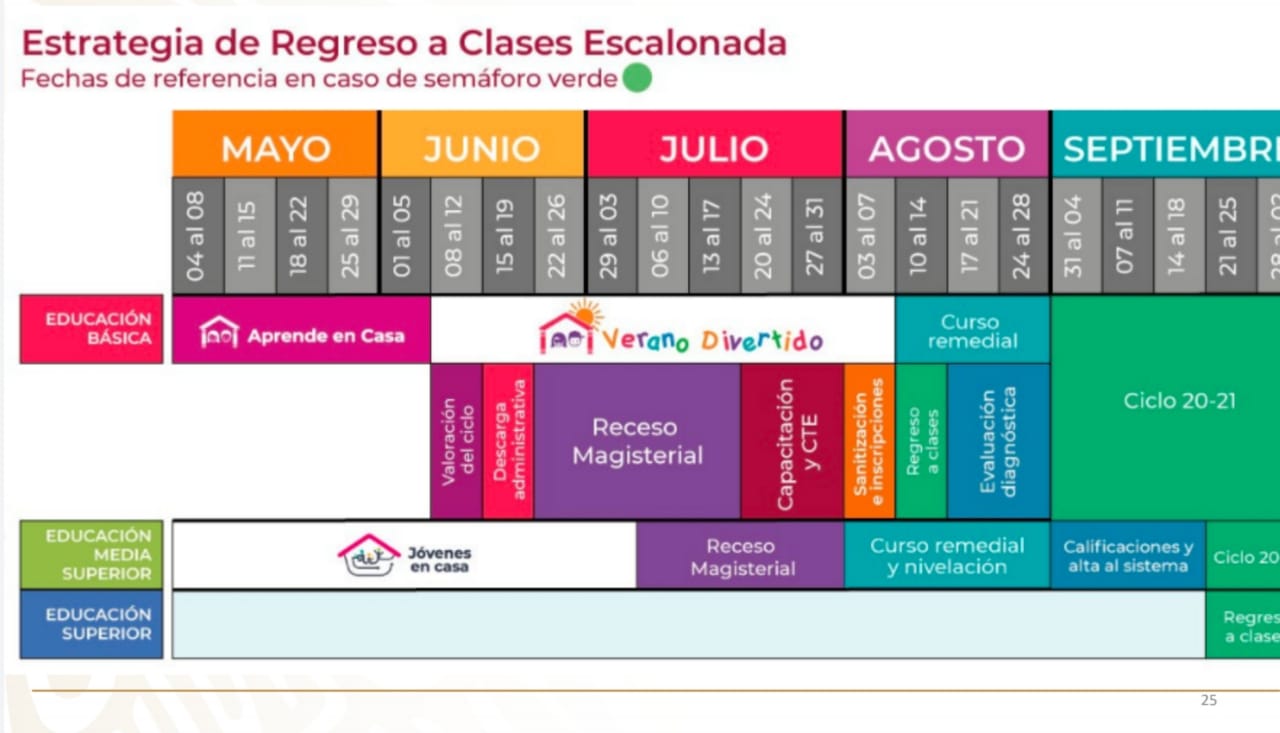 La llamada “Estrategia de regreso a clases escalonada” para educación básica contempla que el periodo del programa Aprende en casa concluye el 5 de junio, a fin de iniciar con el periodo vacacional, denominado “Verano Divertido” del 8 de junio al 07 de agosto.