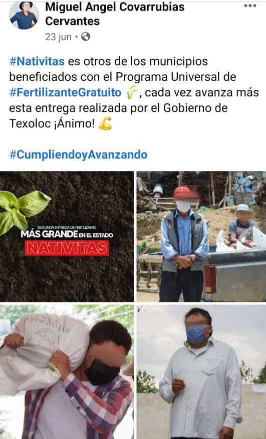 En las fotografías de la distribución del fertilizante que ha sido promocionada por su hijo el diputado Miguel Ángel Covarrubias, como la más grande del estado, se observa el uso de la imagen que hace referencia al escudo de Texoloc.
